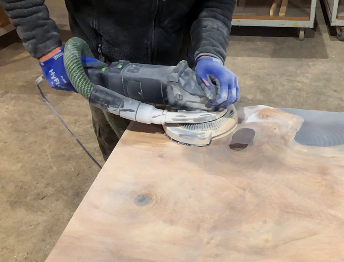 Nach dem Gießen des Epoxidharzes wird die Naturkantentischplatte in mehreren Durchgängen geschliffen. Dabei kommen Schleifpapiere mit immer feiner werdender Körnung zum Einsatz. Dieser Prozess gleicht Unebenheiten aus, bringt die Holzmaserung zum Strahlen und sorgt für einen nahtlosen Übergang zwischen Holz und Harz. Ob ein seidenmatter Look oder ein hochglänzender Spiegelglanz – das Polieren des Epoxidharzes verstärkt die Farben und Tiefe des Holzes und lässt das Epoxidharz wie Glas wirken.