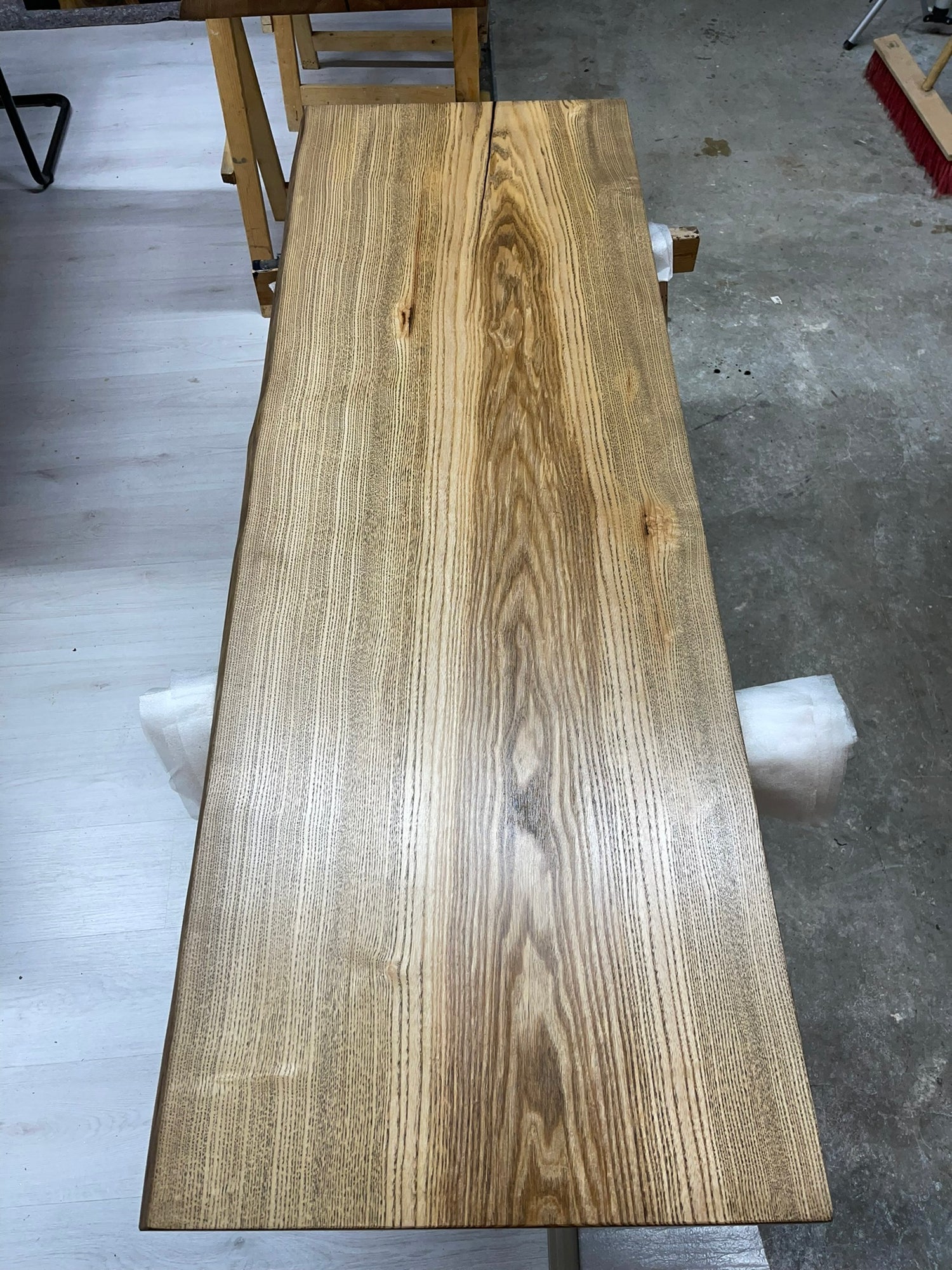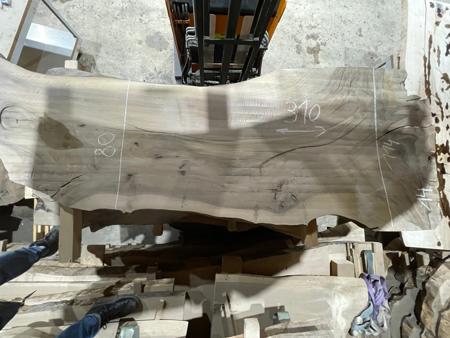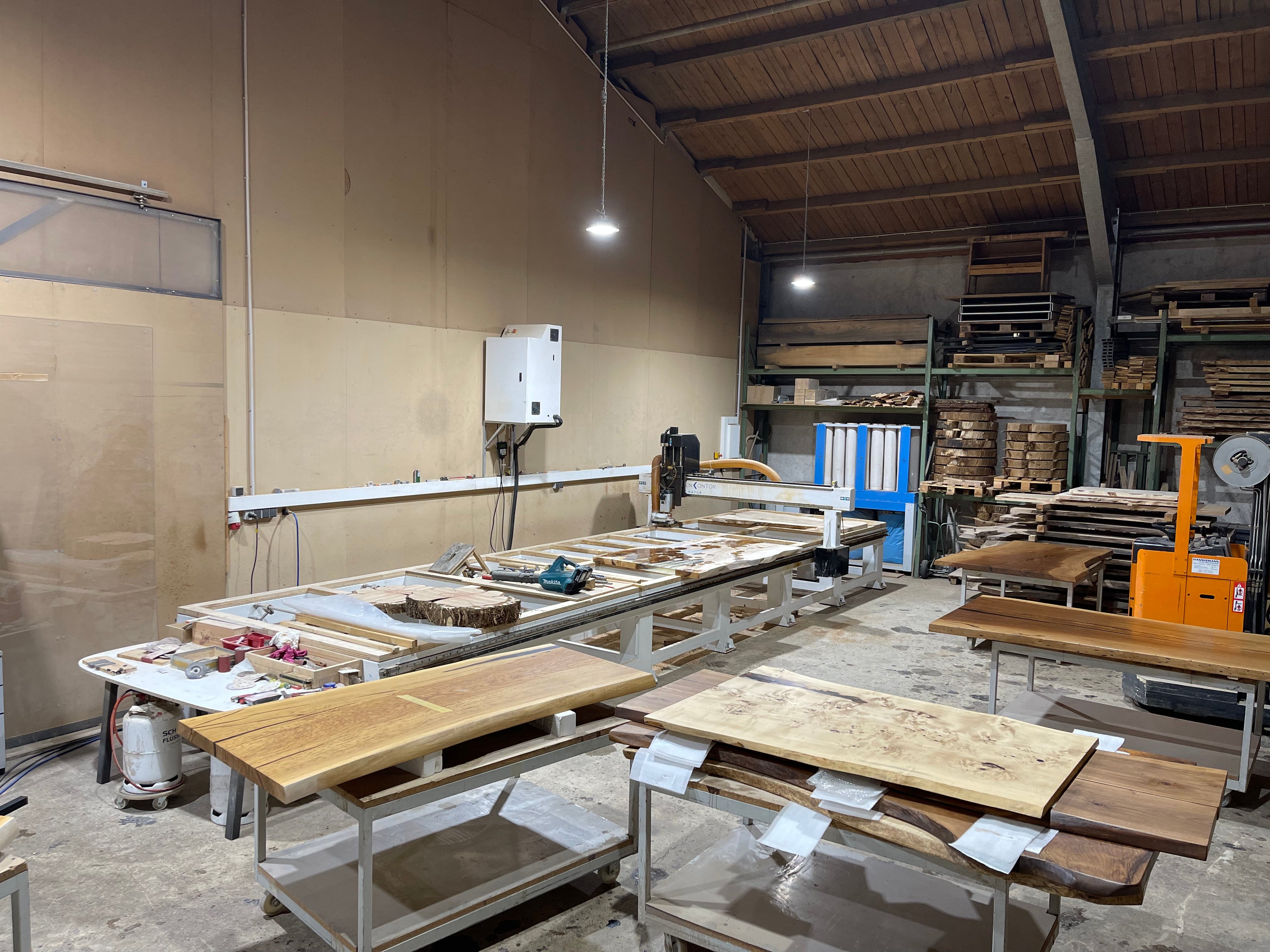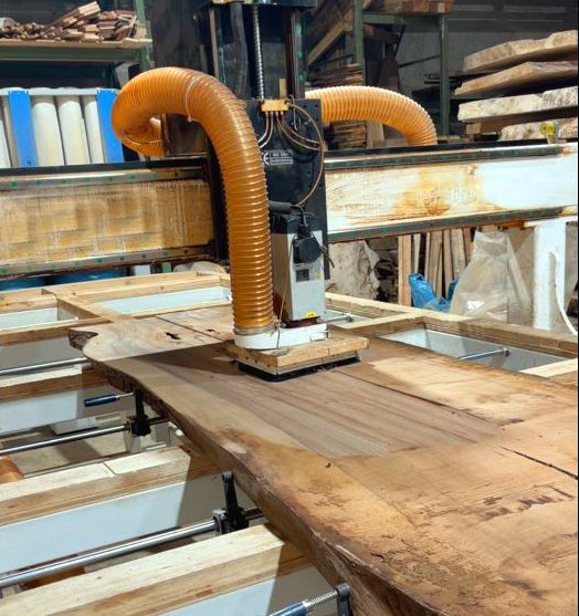 Das Planfräsen ist ein essenzieller Arbeitsschritt beim Bau eines Naturkantentisches, der sowohl Funktionalität als auch Ästhetik sicherstellt. Ziel ist es, die Rohholzplatten präzise zu bearbeiten und eine absolut ebene Oberfläche zu schaffen. Unebenheiten wie Verwerfungen, Schüsseln oder leichte Verdrehungen, die beim Trocknen des Holzes entstehen können, werden dabei beseitigt. Gleichzeitig bringt dieser Arbeitsschritt die einzigartige Maserung des Holzes perfekt zur Geltung – ein entscheidender Moment, um die natürliche Schönheit und die lebendige Struktur des Materials herauszuarbeiten.