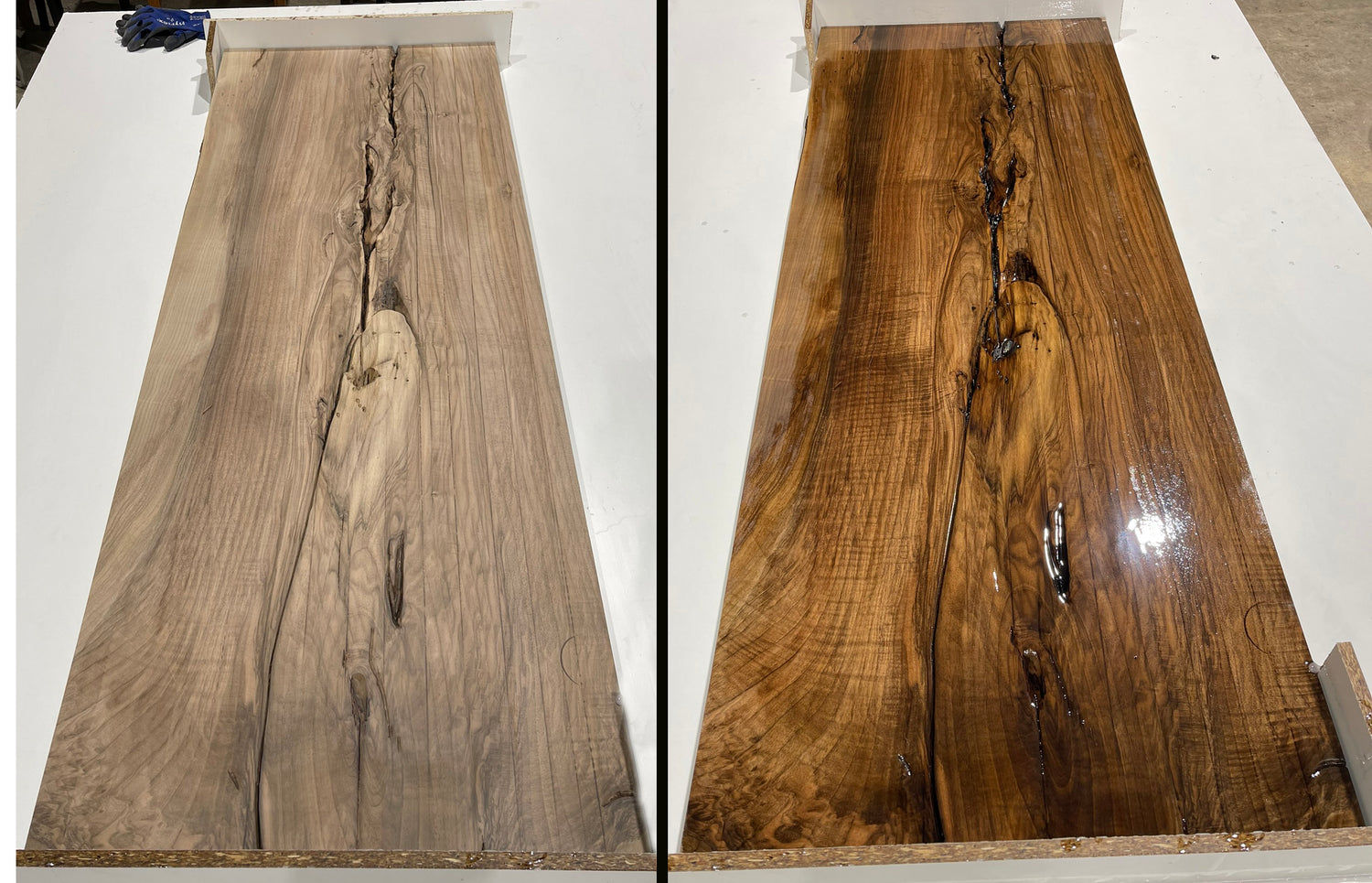 Das Epoxidharz wird in Risse und Astlöcher gegossen. Nachdem es sorgfältig ausgehärtet ist, entsteht eine glatte, robuste Oberfläche. So werden die einzigartigen Merkmale des Holzes hervorgehoben. Gleichzeitig wird dadurch auch die Langlebigkeit der Tischplatte erhöht. Das Ergebnis ist eine perfekte Verbindung von Natur und Design – ein Naturkantentisch, der die Blicke auf sich zieht und durch seine Individualität überzeugt.